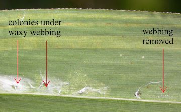 Aphid colonies on lower leaf surfaces, (Takecallis